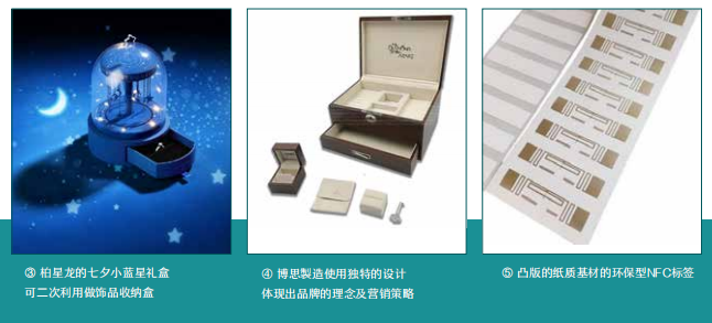 博思製造主要与品牌或其代理商合作,通过掌握其概念 构思,使用独特的设计、颜色及材料,从而在产品中体现 出品牌的理念及营销策略。④ 凸版 (Toppan) 开发的环保型 NFC 标签,使用纸质材料替代传统 PET 薄膜,将塑料的使 用量减少为零。新型电路形成技术则保证了 NFC 标签所需要的通信性能。通过灵活运用纸质基材的特性,撕开后天线 被破坏无法通信,有效防止恶意复用。⑤