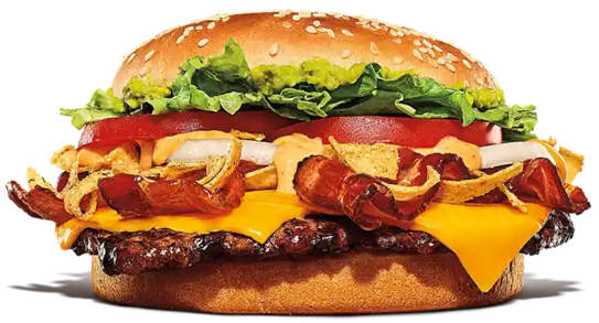 双层四分之一磅牛肉饼搭配牛油果酱、培根、调味玉米脆片、美国奶酪、生菜、白洋葱片、西红柿和奶油辣酱,夹入芝麻面包。